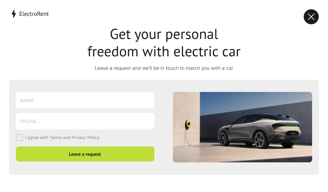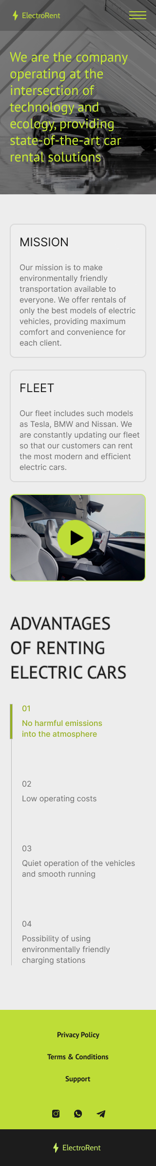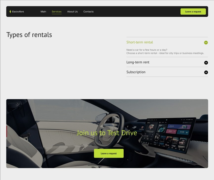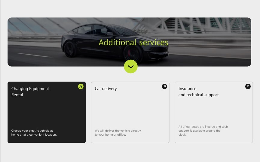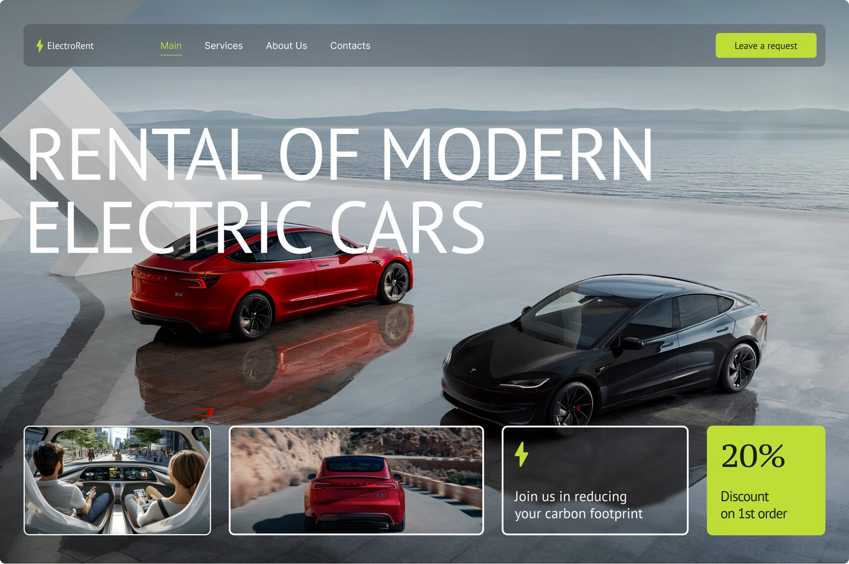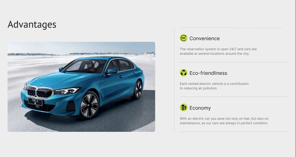 Визуальные элементы: Большие изображения электроавтомобилей, слайдеры и инфографика, показывающая преимущества аренды электромобилей, привлекали внимание посетителей и создавали визуальную привлекательность.